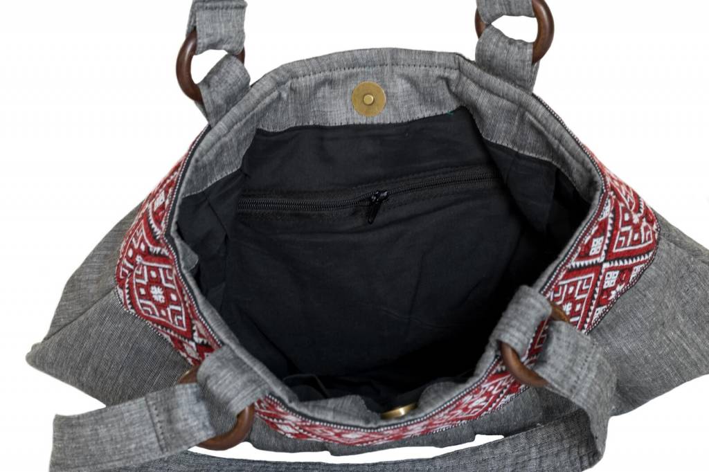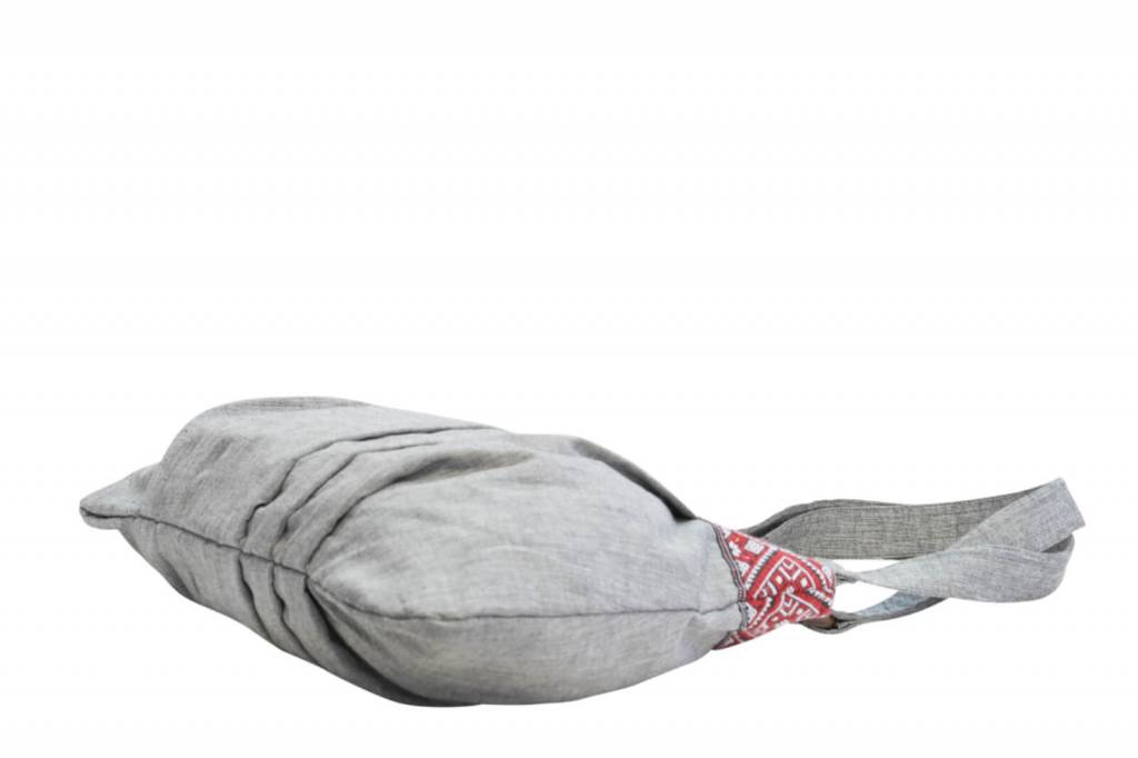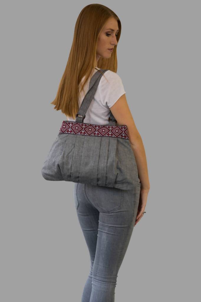 die graue Schultertasche aus Baumwolle. Das gewisse Etwas verleiht ihr die Raffung, die an der handgewebten Bordüre ansetzt.