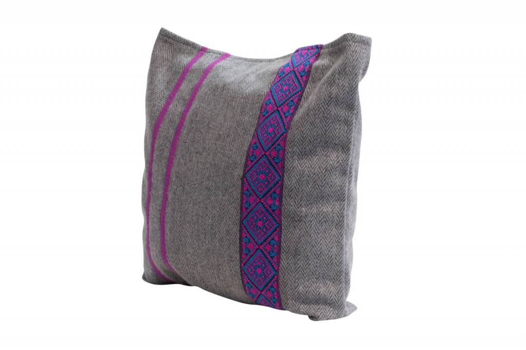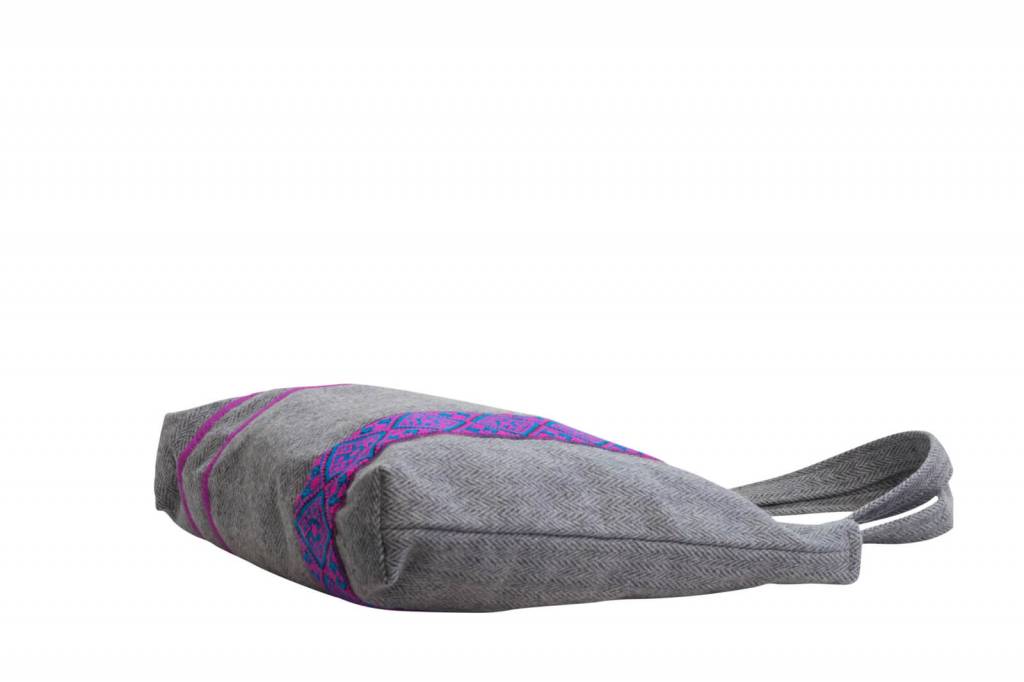 Grauer stabiler Tweedshopper mit großem Stauraum. Ob beim Einkaufen oder für Freizeitunternehmungen, im großen Hauptfach kriegst du eine Menge unter. Außerdem beherbert er zwei Innentaschen für all die kleinen Dinge, die schnell zur Hand sein sollen. Die leuchtende handgewebte Bordüre in fuchsia und türkis bildet einen schönen Kontrast.
