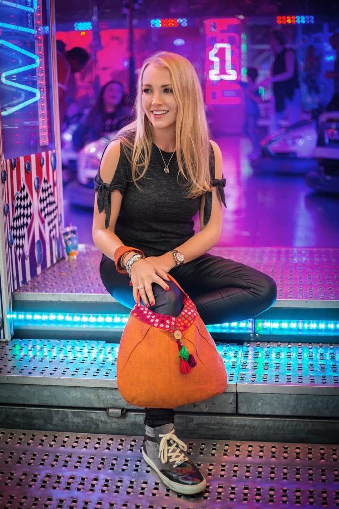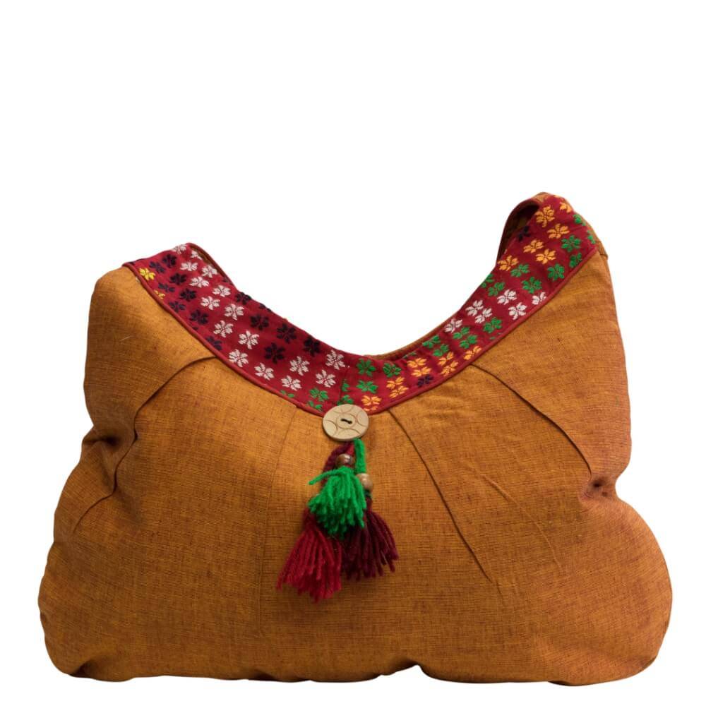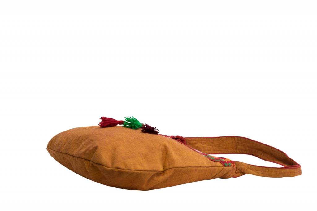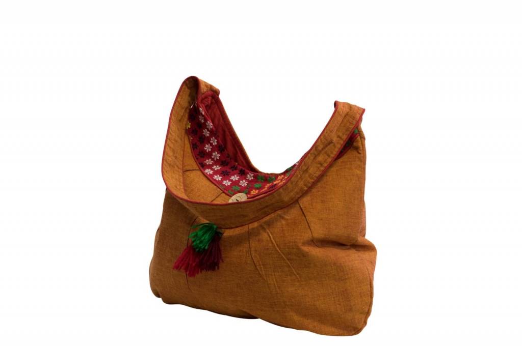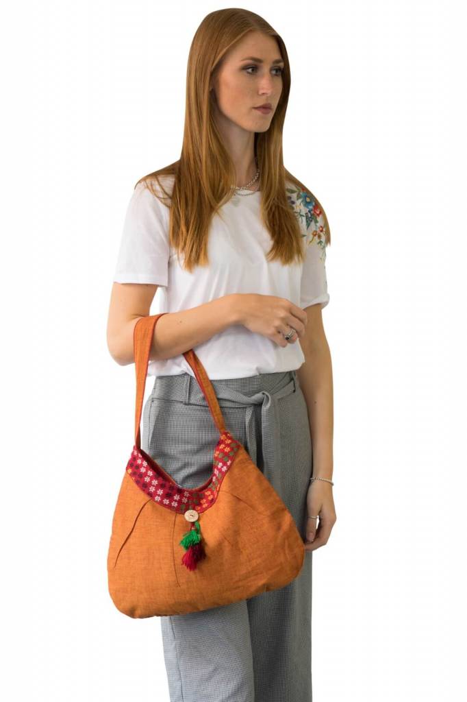 An eye-catcher is the small, semicircular orange-rust-coloured shopper with a hand-woven border and a cheerful, colourful charm. It can be closed with a magnetic button, inside there is a zipped compartment and a smartphone compartment for your most important utensils.